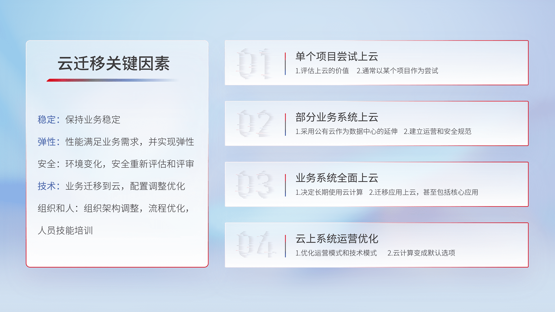 结合实际业务,,,,从规划设计、、云平台选型、、、云原生改造、、、、数据迁移、、、、集成交付,,,,迁移全过程为客户识别最佳上云路径,,,做好风险识别管理,,,,设计网络架构、、、、身份权限、、、安全审计合规、、、操作审计、、、日志审计、、监控告警策略、、、、多站点容灾设计等,,对云上基础设施进行整体规划,,,,提升IT治理水平,,,,以满足弹性、、高可用、、、、高性能的需求。。。。