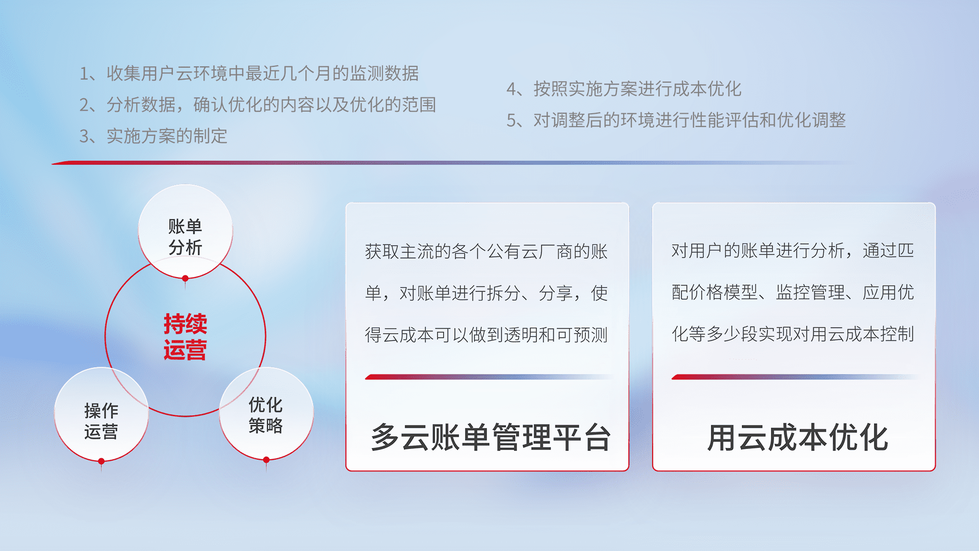 通过多云纳管,,以统一的资源数据模型把客户的云资源进行抽象和封装,,,,进而实现对多云资源的统一操作,,,,保障云资源管理的可靠性、、、、稳定性与可用性。。。。量身定制化运维内容,,,配置、、、、开发运维、、补丁管理、、、备份、、、监控、、、认证和访问管理、、、、审计和日常巡检等,,,,保障在用云过程中的可靠度,,稳定度以及高可用率。。