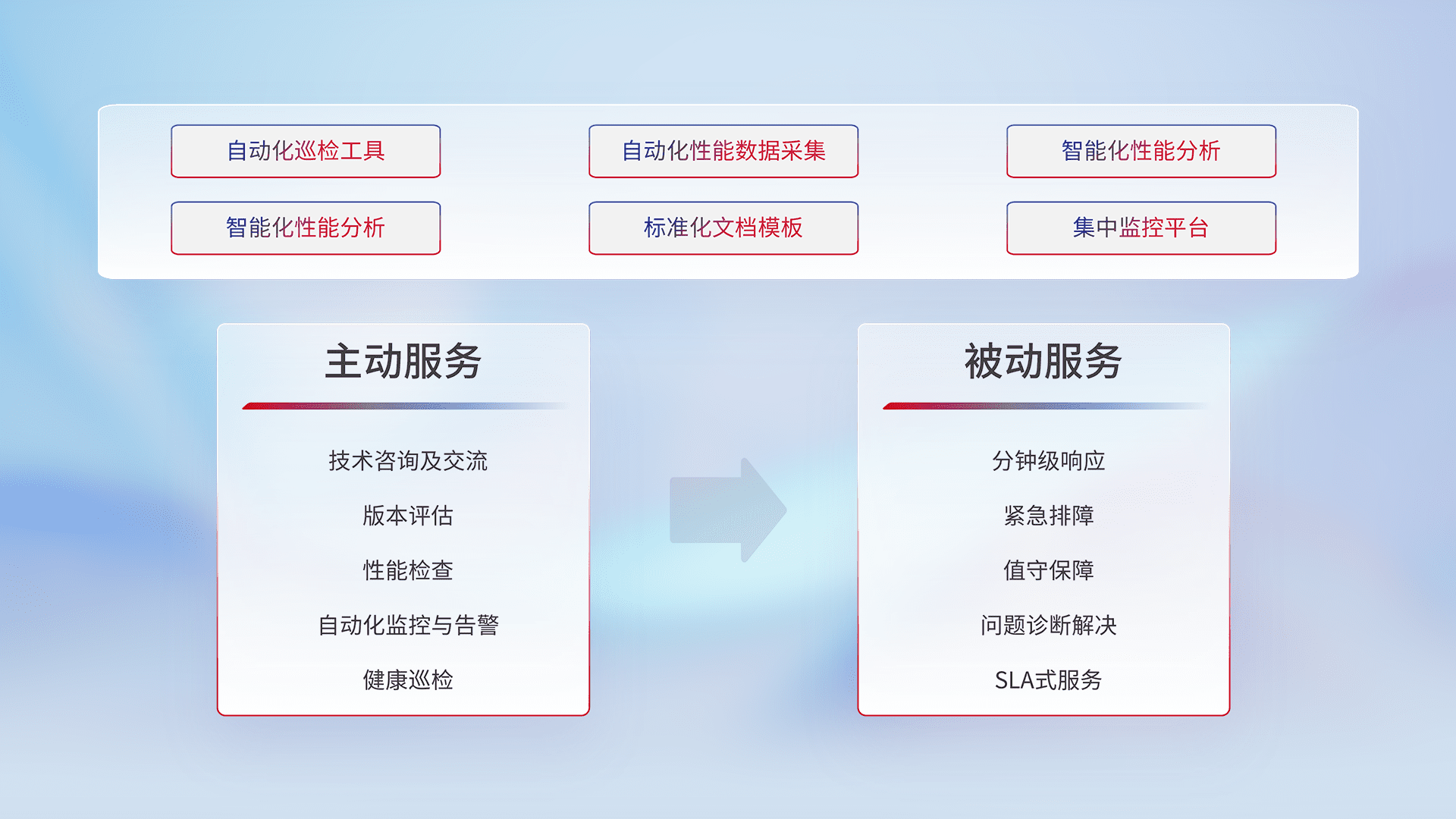 智能化工具和标准化文档,,,保障服务质量,,,提供主动服务(包含技术咨询、、、、版本评估、、、性能检查、、、自动化监控与告警、、、、健康巡检)和被动服务包含(分钟级响应、、紧急排障、、值守保障、、、问题诊断解决、、、、SLA服务)。。
