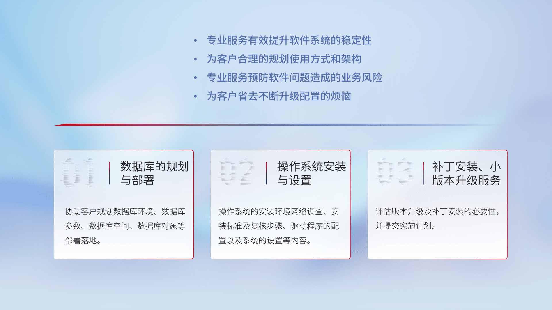 为客户提供软件规模升级、、快速部署、、、、按需配置的专业服务,,,,从数据库的规划与部署到操作系统的安装与设置,,,再到补丁安装和小版本升级提供支持。。
